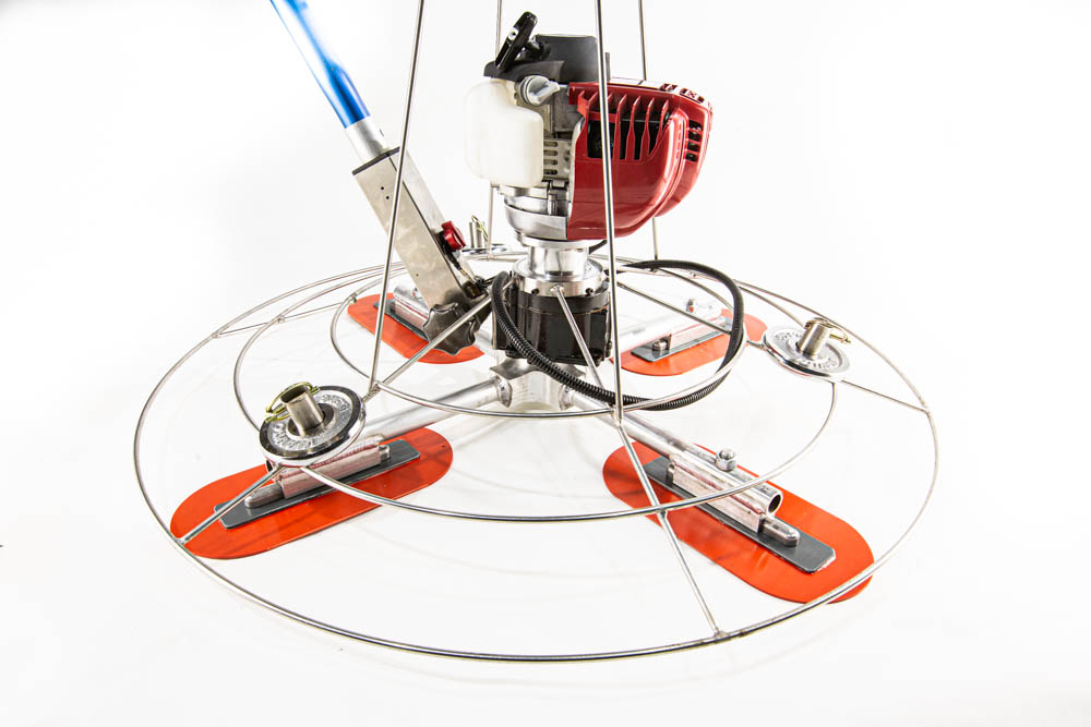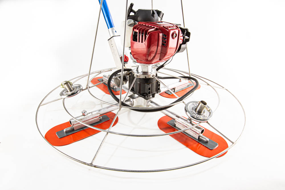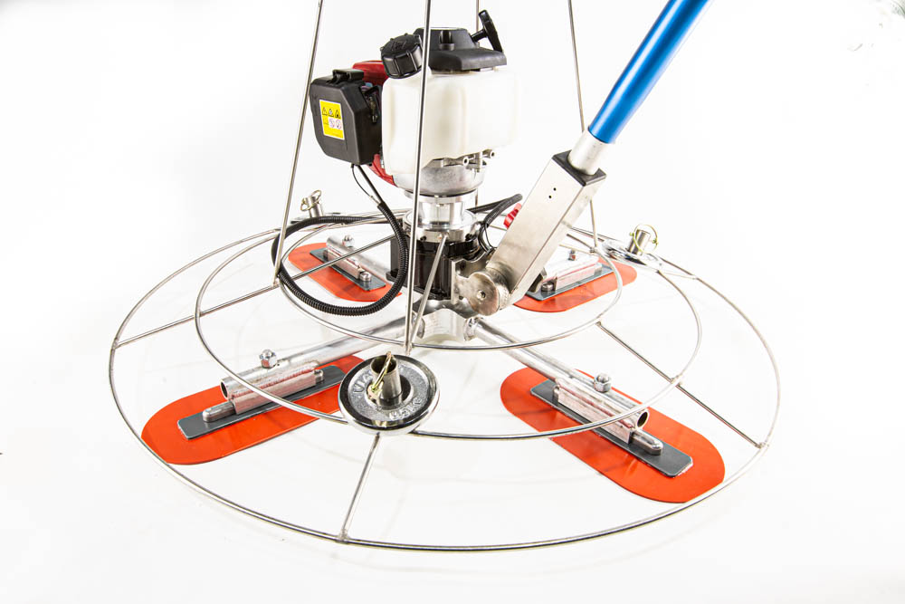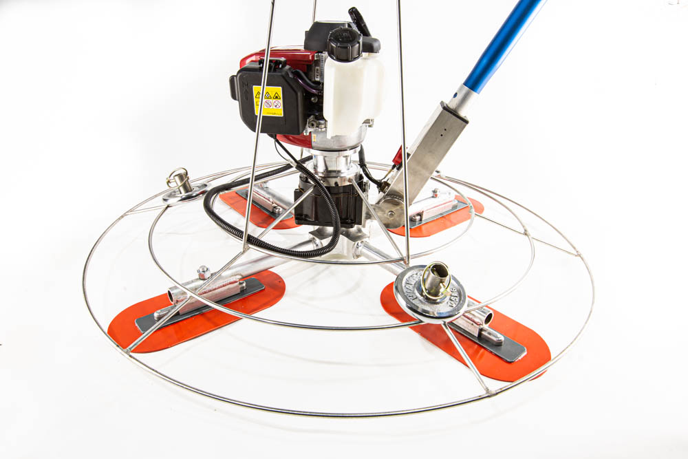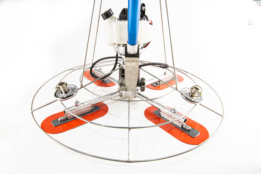 A lightweight trowel designed for finishing resinous surfaces like resin bound stone , epoxy stone carpets and PU screeds. Due to its light weight and possibility of extending the handle it can be successfully used in early finishing of concrete allowing faster installation. Additional weights are included, which can be added when the material requires better compaction . Works great on any resin bound material – stone, rubber and many epoxy coatings as well. Results in an unrivalled finish that cannot be achieved by hand trowelling or with heavier machines. Can be used after hand trowel application to remove trowel marks, or with weights and by experienced operatives, straight from the screed sledge.Specifications